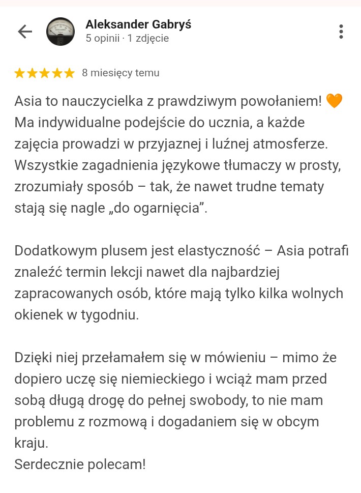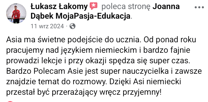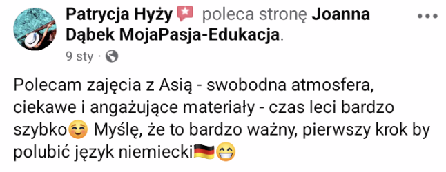 Z tej strony Asia Dąbek – ekspertka d.s skutecznej nauki języka niemieckiego, fanka personalizacji i neuronauki. Z miłości do języków i pasji do edukacji stworzyłam indywidualny program, który pozwoli Ci zacząć mówić swobodnie i bez stresu. Wszystko w zgodzie z naturą mózgu! Opracowałam Niemiecki dla Piłkarzy – skroję kurs na miarę Twoich potrzeb.