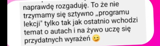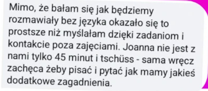 4️⃣ MASZ MOJE WSPARCIE POZA SESJAMI KONWERSACYJNYMI: od poniedziałku do piątku w razie jakichkolwiek pytań i wątpliwości, masz możliwość kontaktu i wsparcia w godzinach 10-17:00 / nie musisz czekać z pytaniami dotyczących zadań domowych do kolejnych zajęć!